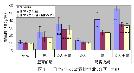飼料米を配合した低蛋白質アミノ酸添加飼料を給与した場合でも、窒素排泄量が減少することから、環境への負荷が軽減できる。 |