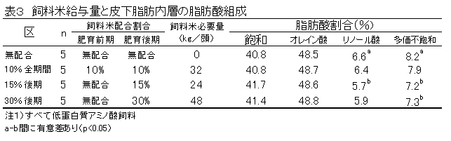 一方、玄米はトウモロコシと比較して脂肪含量が少なく、多価不飽和脂肪酸割合が低い特徴を持つことから、飼料米給与による皮下脂肪の脂肪酸組成への影響を明らかにする必要がある。