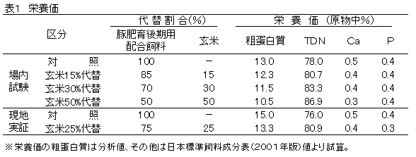 玄米の代替割合を高くすると、粗蛋白質が低くTDNが高い低蛋白質・高カロリー飼料となる(表1)。 |