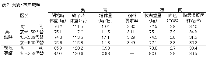 玄米を50%まで代替しても日増体量は変わらず、枝肉成績にも差はない(表2)。 |