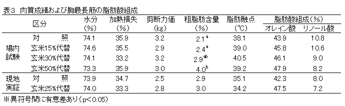 胸最長筋中の粗脂肪含量は、対照の2.1%に対し、玄米50%代替では4.0%と有意に増加する(表3)。 |