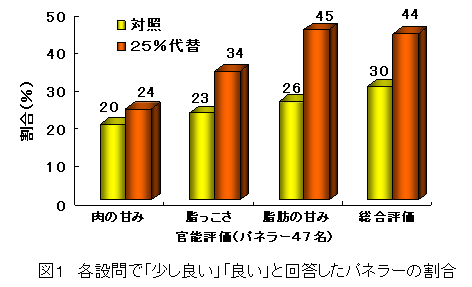 現地実証試験で生産された豚肉を使用し、男女47名をパネラーとして、「悪い・少し悪い・普通・少し良い・良い」とする5段階評価で官能検査した結果、総合評価で「少し良い」「良い」の割合が、対照の30%に対し、玄米代替は44%と高い。特に脂肪の甘みの評価が対照の26%に対し、玄米代替は45%と高い(図1)。 |