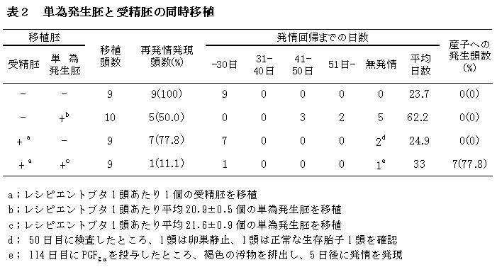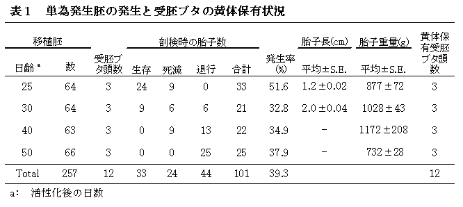 単独で移植した単為発生胚の39.3%は、胎齢25~30日まではおもに胎子として、それ以降は、胎子遺残物として子宮内に存在する(表1)。 |