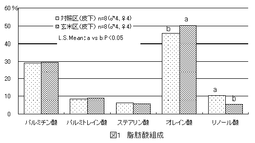 信州黄金シャモにトウモロコシの代替として玄米を給与すると、肉色、脂肪色は黄色みが低下する。皮下脂肪の脂肪酸組成は、オレイン酸割合が上昇、リノール酸割合が低下し、皮つき肉では食味評価に影響を与える一因となる。 | ||||||||||||