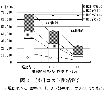 堆肥を用いずに化学肥料のみ施用した栽培と比較して、2年間の合計の肥料コストは堆肥1.5tで35%、3tで66%低減できる(図2)。 |