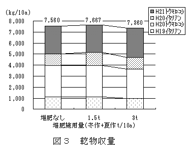 乾物収量は、トウモロコシ、イタリアンライグラスともに堆肥1.5t、3t施用で化学肥料のみ施用した栽培と同程度となる(図3)。 |