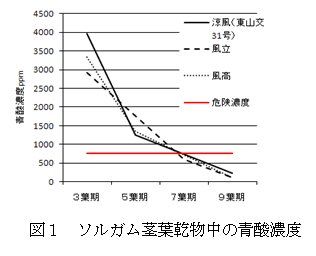 1. ニホンジカによるソルガムの食害は、茎葉の青酸含量(図1)が、家畜に対する危険濃度(750ppm)以下なる播種後30日前後(6~7葉期頃)から見られるようになる(表1)。