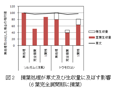 ニホンジカは、ソルガムよりトウモロコシを好む傾向が強く、トウモロコシの場合、地際まで食害し、葉を1枚も残さない場合が多いが、ソルガムは葉を1枚以上残すので、その後の生育が有利となる(図3)。トウモロコシ、ソルガムとも、6葉完全展開期に、葉を完全摘葉すると、無処理の場合に比べ、生収量は40~50%減少するが、1葉だけ残した場合は、20%程度の減収にとどまる(図2)。 |