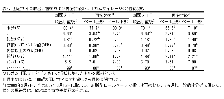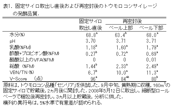 以上の結果から、固定サイロから取出したトウモロコシおよびソルガムサイレージを細断型ロールベーラを用いて梱包後、再密封したロールベールサイレージは、変敗することなく、発酵品質を保持できる。 |