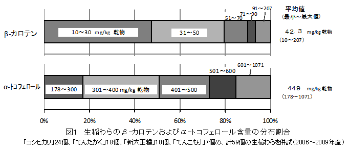 2006~2009年産の生稲わら58個の分析値において、β-カロテン含量は乾物中10~207 mg/kgと幅があるが、約8割は10~50 mg/kgの範囲にある。α-トコフェロール含量は乾物中178~1071 mg/kgと幅があるが、約8割は178~600mg/kgの範囲にある(図1)。 |