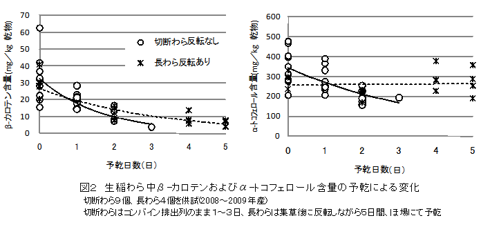 予乾やサイレージ調製により、生稲わら中のβ-カロテン含量は低下し、α-トコフェロール含量はある程度維持されることから、肥育牛への給与に有利である。 |