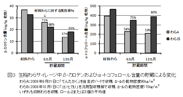 β-カロテンおよびα-トコフェロールを、乾物あたりそれぞれ33~37mg/kgおよび400~466mg/kg含む生稲わらで調製したサイレージにおいて、β-カロテン含量は貯蔵期間の長期化にともない漸減するが、α-トコフェロール含量は貯蔵6ヵ月以降の低下が少なく、1年間貯蔵しても乾燥稲わらの含量までには低下しない(図3)。 |