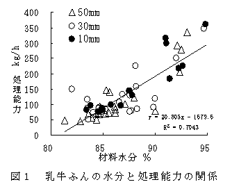 本試作機の処理量は水分85%の乳牛ふんでは89kg/hとなり、水分が低いほど処理量は低下する(図1)。また、乳牛ふんの水分が83%以下では粘性が高くなり、固液分離操作が困難となる。 |