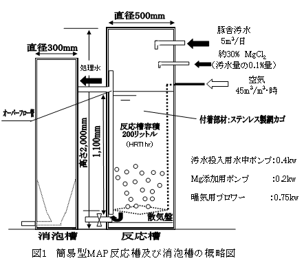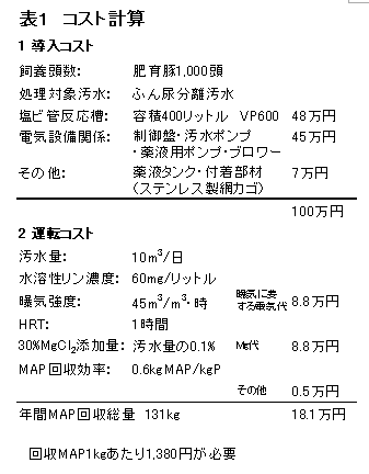 肥育豚1,000頭規模(汚水量10m3/日)への簡易型MAP反応槽の導入コストは、1)塩ビ管反応槽で48万円、2)電気設備関係で45万円、3)その他7万円の合計100万円である(表1)。 |