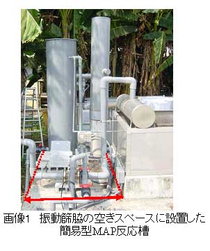 本装置は、塩ビ管で作成した簡易な反応槽であるとともに、省スペース型の反応槽であるため、既存施設の空きスペースに低コストで設置が可能である(画像1)。 |