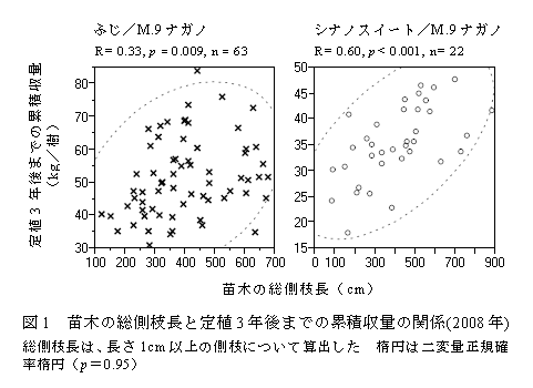 ふじ/M.9ナガノ、シナノスイート/M.9ナガノにおいて、苗木の総側枝長が長く側枝本数が多いほど、初期収量が優れる傾向が認められる(図1、一部データ略)。ただし、ふじ/M.9ナガノでは、総側枝長が700cmを超えるような大きな苗木において、植傷みなどの理由により定植後の頂芽数の増加が劣る場合がある(データ略)。 |