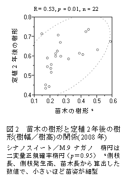 苗木の樹形が細型であれば、定植後の樹形も細型となりやすく(図2、一部データ略)、密植度の高い栽植様式に適合しやすい。 |