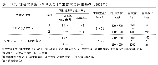 密植度の高いリンゴのわい化栽培に適する2年生わい性台木苗木(ふじ/M.9ナガノ、シナノスイート/M.9ナガノ)の品質は、主に側枝本数で評価し、長さ5cm以上50cm未満の側枝本数が、概ね10本/苗以上であることを目標とする。 |