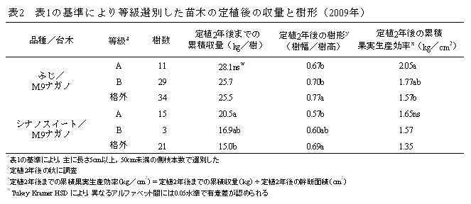 苗木の定植後の生育や収量は、苗木の特性だけでなく、側枝管理や着果管理などの栽培条件,気象条件、ほ場環境などの影響を受けて変動する。一般的に、大きめの苗木は植傷みを生じやすいので注意が必要である。 |