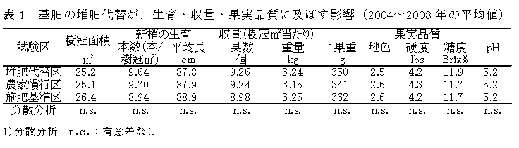 この堆肥施用法は、施肥基準区および農家慣行区と比較して、生育・収量・果実品質は同等である(表1)。 |