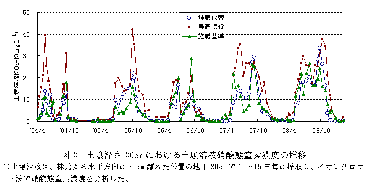 この堆肥施用法は、土壌深さ20cmにおける土壌溶液のNO3-N濃度が5年間の平均値で6.9mg/Lであり、施肥基準区の6.7mg/Lと同等で変動時期にも大きな相違は認められないことから、生育に十分な窒素の肥効を示すと考えられる(図2)。 |