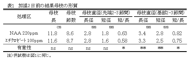 ハウスミカンの夏芽母枝へ1-ナフタレン酢酸ナトリウムを散布した場合、エチクロゼート散布に比べ結果母枝中のデンプン蓄積が多く硝酸態窒素含量の低下が早い。また、結果母枝の断面は円形に近く、加温後の着花は有葉花の割合が高い。 | ||||||