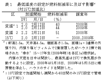 ニホンナシ「幸水」のハウス栽培では、最低気温設定を加温開始から15℃一定で管理するより、10℃で加温開始し満開から40日の期間だけ15℃にすることにより、40%以上燃料消費量を削減でき、かつ、満開日から収穫日までの日数を短縮することができる。 |