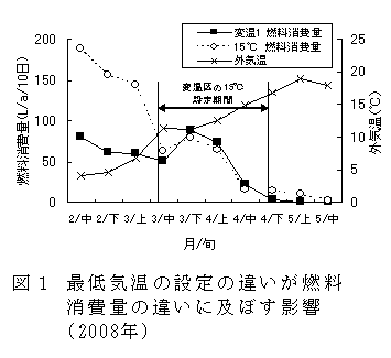 燃料消費量は外気温が低い時期に多く、この時期に低い温度設定をすることが燃料消費量の削減につながる(図1)。 |