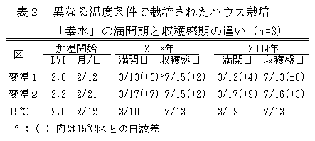 2月12日から加温、15℃一定で管理するのと比較し、同日から加温の変温では満開日が3~4日遅れるのに対し、収穫盛日の遅れは0~2日となる。2月21日から加温した変温では満開日が7~9日遅れるのに対し、収穫盛日の遅れは2~3日となる。変温は満開から収穫盛期までの日数が短かくなる(表2)。 |