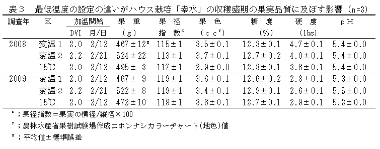 15℃一定と比較して変温の果実品質はほぼ同等である(表3)。 |