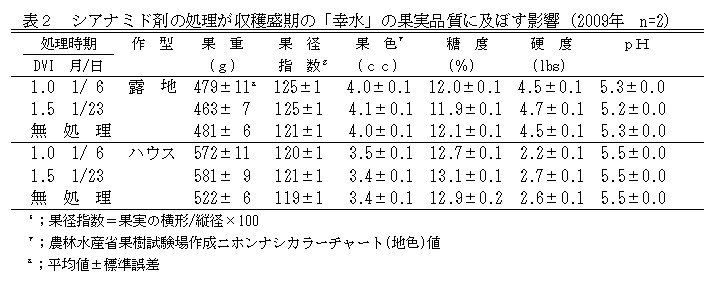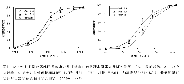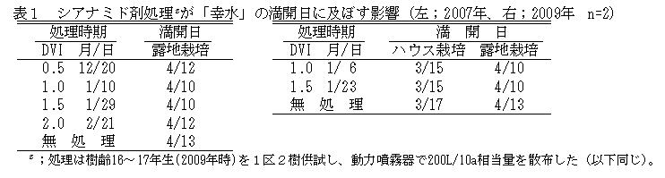 露地・ハウス栽培のニホンナシ「幸水」に、DVI(発育指数)値1.0時にシアナミド剤の散布を行うと、開花が前進され、収穫期も早めることができる。 | ||||||