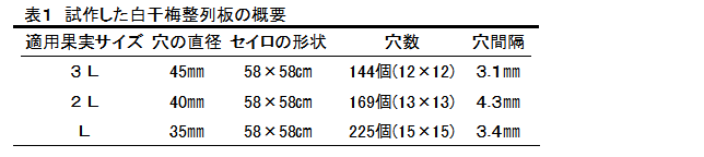 天日干しにかかる作業の大部分は手作業によるものであり、これまで省力化はほとんど進んでいない。塩漬け加工後のウメ果実を天日干しする際に、セイロにセットして果実の整列を図る「白干梅整列板」を試作し、その実用性を検討する。 |