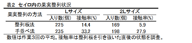 整列板を用いると、手並べ法に比べて5~15%程度入り数が減少するが、果実同士の接触率は手並べ法の半分以下に減少し、干しムラの発生防止につながる(表2)。 |