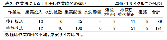 天日干しに要する1サイクルの作業時間は、手並べ法が191秒であったのに対し、整列板法では89秒に短縮され、作業能率が高い。また、ハウス内の作業となる「板抜き・並べ補正」は手並べ法で51秒であったのに対し、整列板法では11秒に大幅短縮され、夏季の高温条件下では負荷軽減につながる(表3)。 |