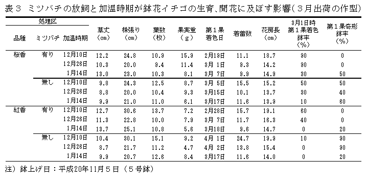 「桜香」「紅香」ともに、9月下旬に花芽分化を確認後鉢上げを行い、最低夜温10℃で管理すると12月中旬に、11月上旬までに鉢上げを行い、12月上旬より最低夜温10℃で加温を開始し、ミツバチを放飼すると3月上旬までに出荷可能である。 | ||||||||||