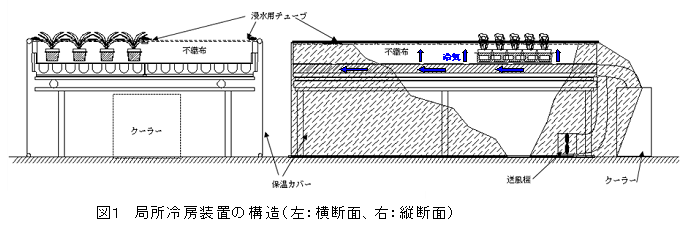 日中は被覆部分に潅水チューブを設置して不織布を定期的に湿らすことにより、気化熱を利用して、株基部内温度を約3℃下げることができる。 |