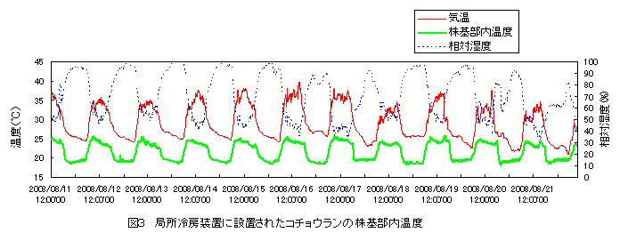 コチョウランの株基部を局所的に冷房することにより花茎を発生させる実用的な局所冷房装置を開発した。本装置の利用により、温室全体を冷房する慣行と比較して同等の花茎発生がみられ、消費電力量は、夏期は約25%、秋期は30~50%削減できると推測される。 |