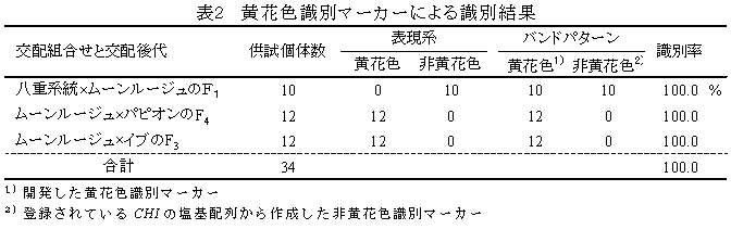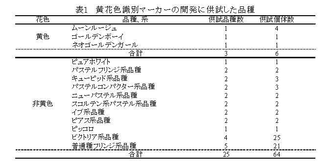 本マーカーは黄花色品種「ムーンルージュ」、「ゴールデンボーイ」、「ネオゴールデンガール」、黄花色以外の品種「ピュアホワイト」、「パステルフリンジ系品種」、「キューピット系品種」、「パステルコンパクター系品種」、「ニューパステル系品種」、「スコルテン系パステル」、「イブ系品種」、「ピアス系品種」、「ピッコロ」、「ビクトリア系品種」、「普通種フリンジ系品種」を用いた場合に利用できる。これ以外の品種に使用する際は、バンドの増幅パターンを確認する必要がある。 | ||||||