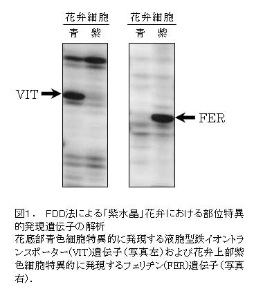花底部青色細胞と花弁上部紫色細胞で発現している遺伝子を解析すると、青色細胞では液胞型鉄イオントランスポーター(VIT)遺伝子が特異的に発現し、紫色細胞では鉄イオン貯蔵タンパク質のフェリチン(FER)遺伝子が特異的に発現する(図1)。 |