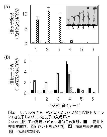 VIT遺伝子は花の発育段階初期(ステージ1~3)に花底部表皮細胞で強く発現し、FER遺伝子は開花直前(ステージ4)に花弁上部表皮細胞で強く発現する(図2)。 |