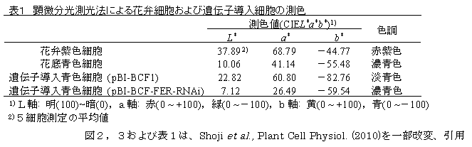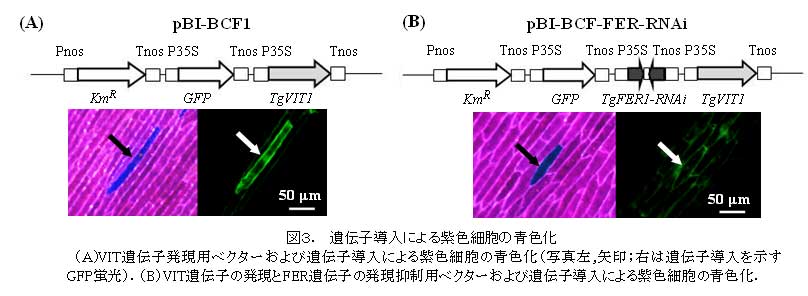 パーティクルガンにより紫色細胞へVIT遺伝子を導入すると淡青色へと変化する。また、VIT遺伝子の発現と同時にFER遺伝子の発現を抑制すると濃青色へと変化する(図3、表1)。