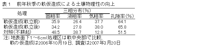 前年秋季に幅160cmの畝を仮造成し、同時に基幹排水路を設置し排水対策を行う。翌春に仮造成した畝を崩さないように成型ロータリを用いて畝立てする。畝を仮造成しない対照に比較して土壌の孔隙率が高くなることから、固相率、液相率は低く、気相率は高くなる(表1)。 |