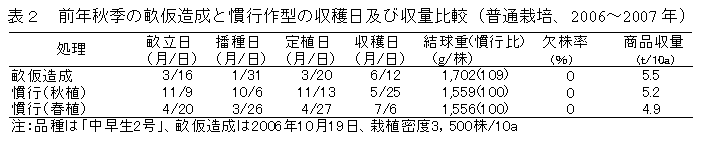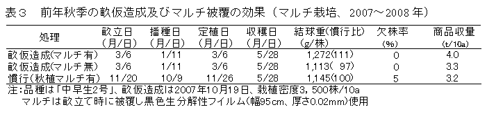 前年秋季に畝を仮造成後3月中旬に畝立てしキャベツ(品種「中早生2号」)を定植した場合には、収穫は慣行の秋植えと春植え栽培のほぼ中間の6月中旬となり、収穫時の結球重がやや大きくなる(表2)。また、3月上旬に畝立てと同時に黒マルチを被覆して定植した場合には、収穫は慣行の秋植え栽培と同じ梅雨前の5月下旬になり、欠株がなく、結球重がやや大きくなることから収量性が高まる(表3)。 |