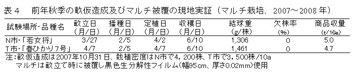 現地の使用品種に合せた実証試験では、6月10日収穫で10a当り4.7~5tの商品収量となることから実用性が高い(表4)。 |