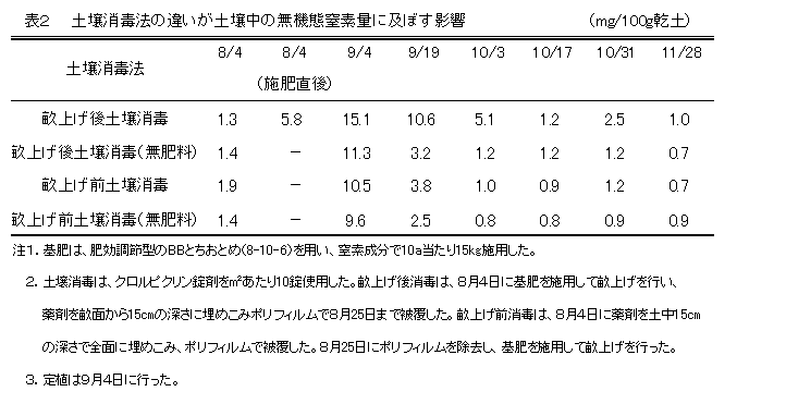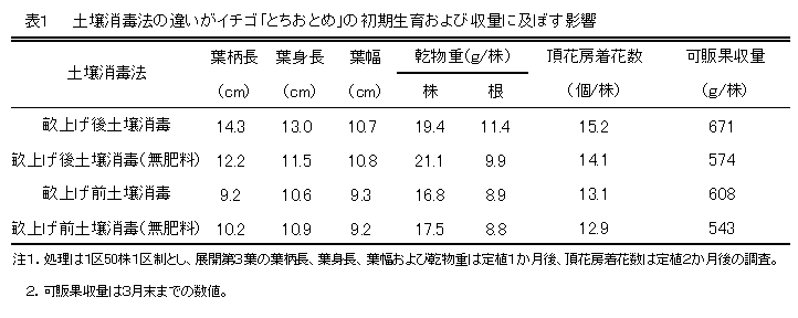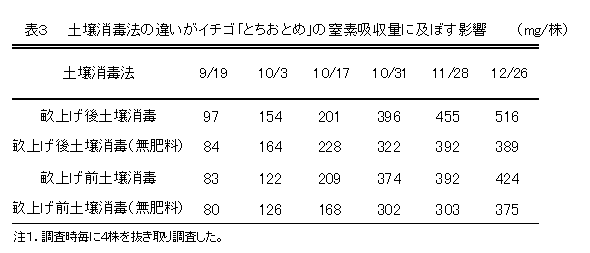 イチゴ「とちおとめ」の畝上げ後土壌消毒における窒素の動態と生育 | ||||||