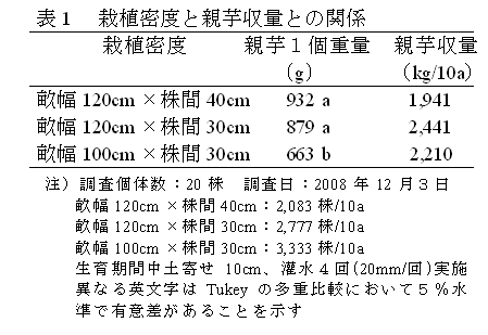 埼玉農総研で選抜した「丸系八つ頭」(仮称)は、栽植密度畝幅120cm×株間30cmの時に親芋収量(10a換算)が最大となる。また、親芋肥大期間中に灌水と土寄せを行うと親芋収量は増加する。 | ||||||