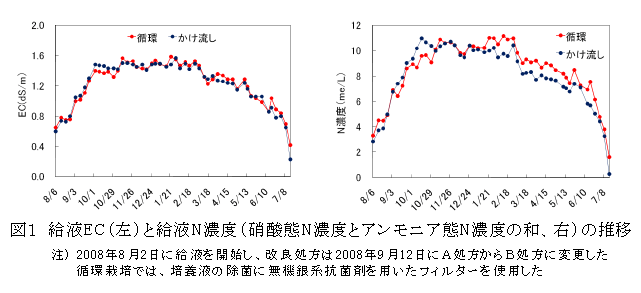 改良処方を用いた循環栽培における給液ECは、山崎トマト処方を使用したかけ流し栽培と同様に、0.6~1.6dS/mの範囲で管理する。この場合、循環栽培の給液N濃度はかけ流し栽培と同程度で推移する(図1)。 |