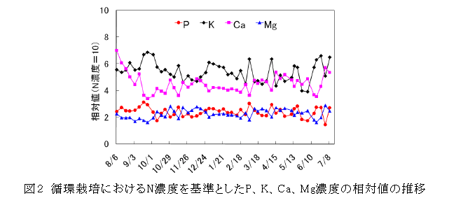 循環栽培における培養液組成は、K及びCaの変動があるものの、栽培期間を通して概ね維持することができる(図2)。 |