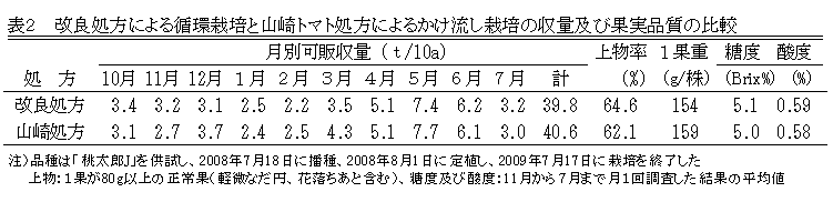 改良処方による循環栽培は、生育後半に減収することなく、長期多段栽培において、かけ流し栽培と同程度の収量が得られる。また、上物率、1果重、果実糖度及び果実酸度もかけ流し栽培と大差なく、同程度の果実品質が得られる(表2)。 |