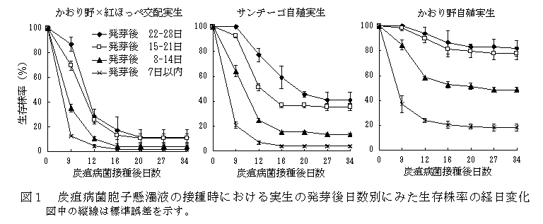 炭疽病菌接種後の生存株率は、発芽後15日より若い実生では若いほど低くなるが、発芽後15日以上では差がなくなる(図1)。そのため、炭疽病菌の接種には発芽後15日以上経過した実生を供試する。 |